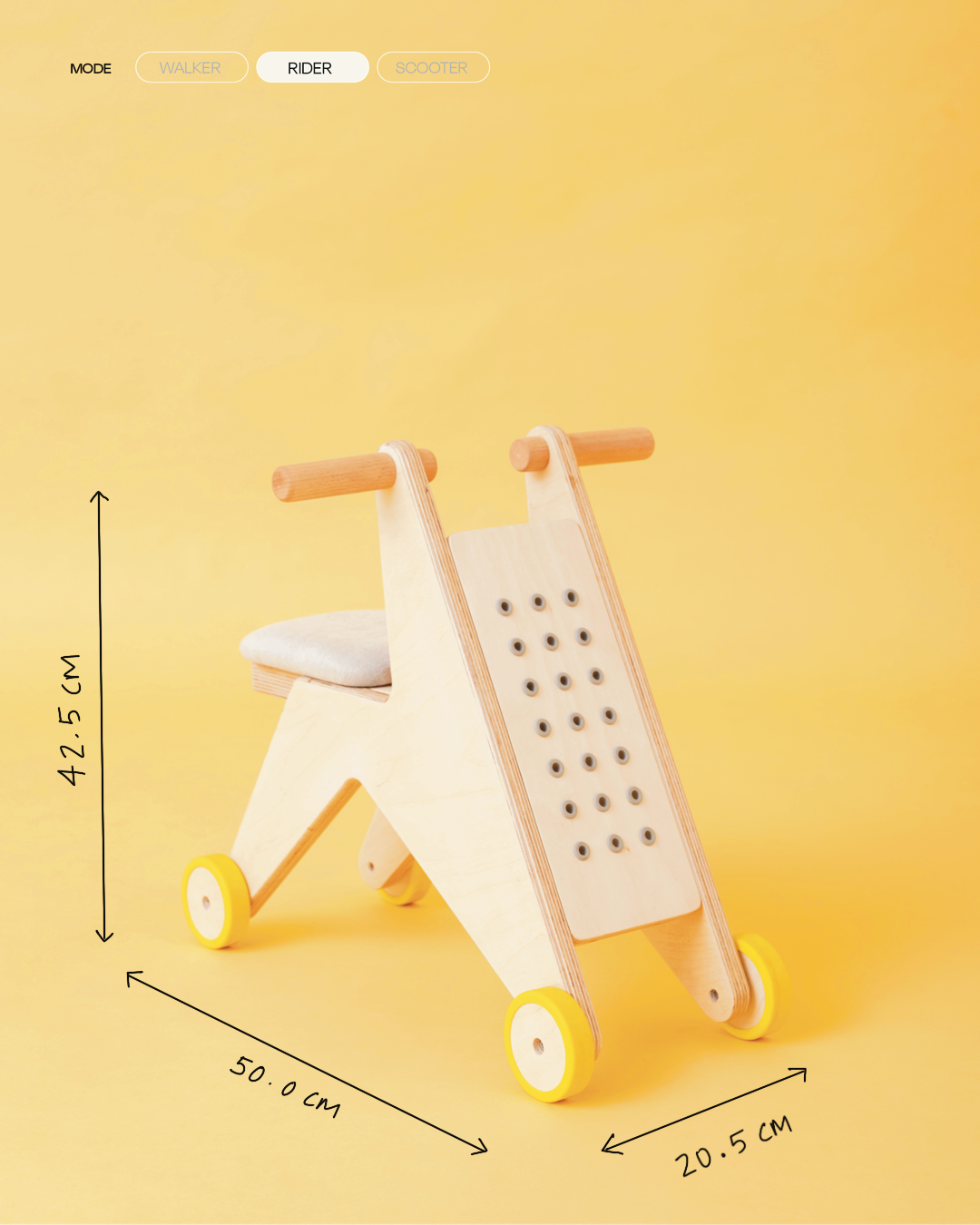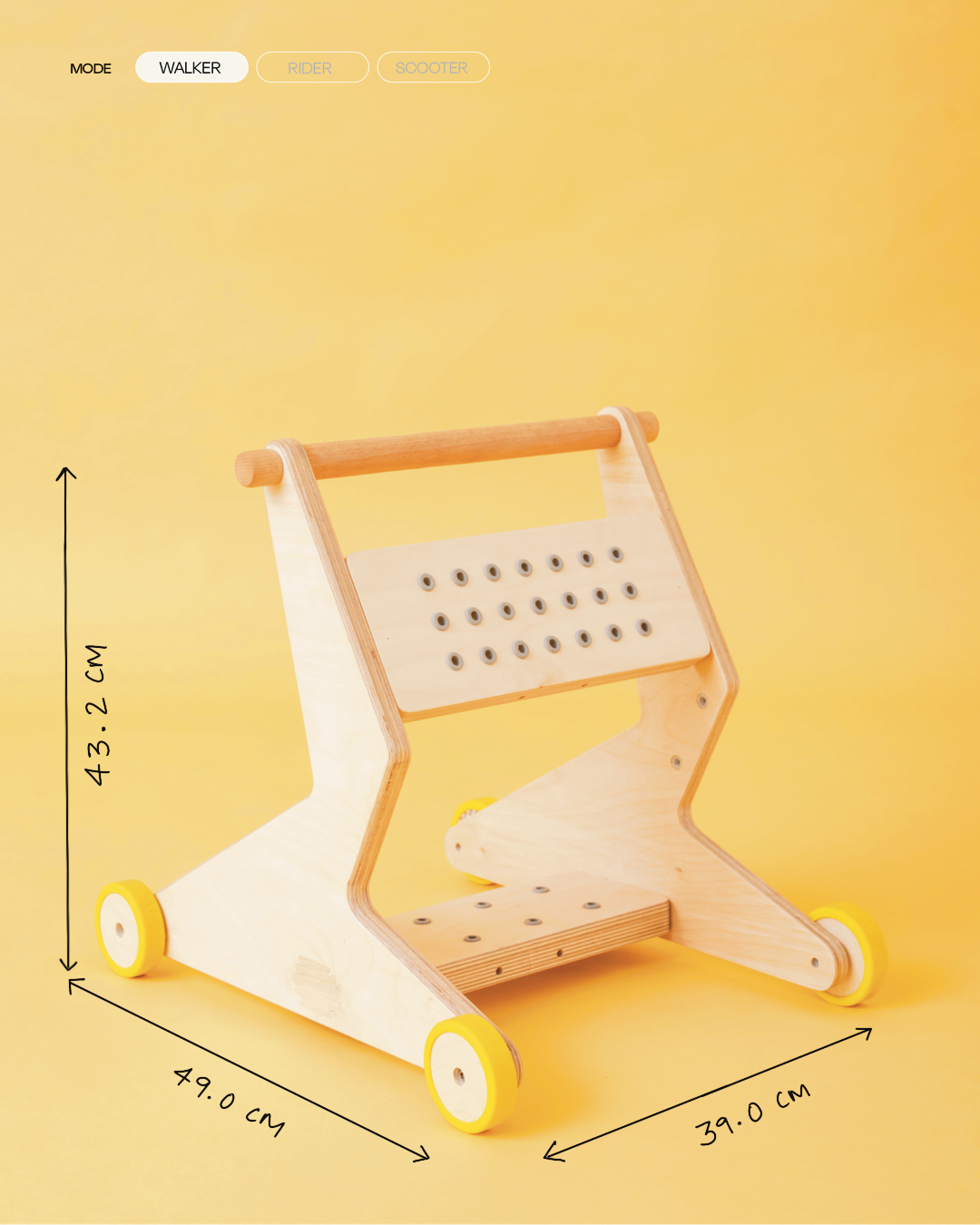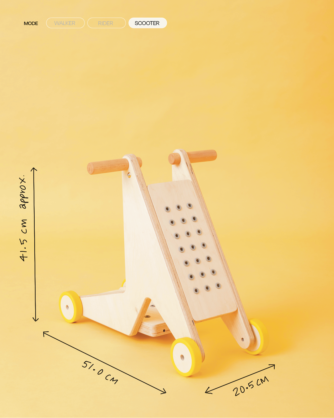 It’s made using sustainable, child safe materials - European Birch plywood, beech wood, silicon grommets and wheels, our proprietary slow and fast wheel mechanisms for the walker and rider / scooter modes respectively!