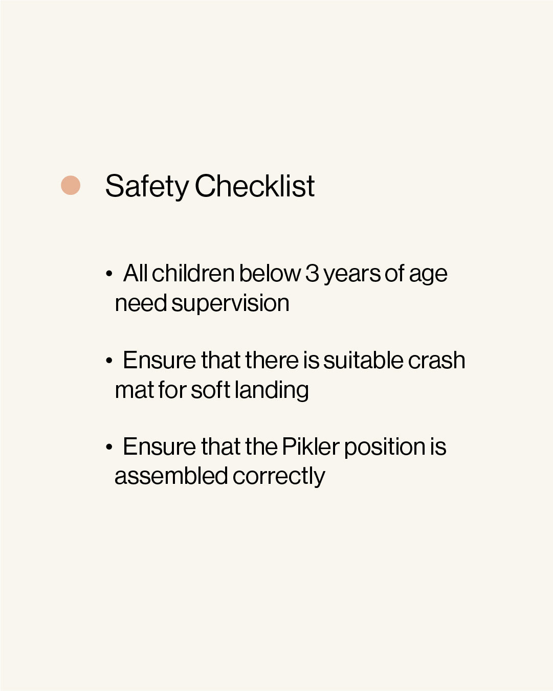 The Ceiling Pikler needs to be installed by a skilled carpenter. We provide all the hardware, tools and a detailed guide to installation.