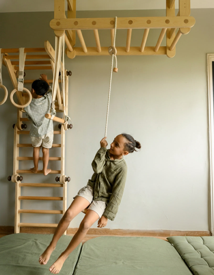 The Ceiling Pikler raises the challenge, so kids can use it well into their teenage years, and even beyond if they continue to enjoy it. Master all the aerial accessories and practice gymnastics moves at home!