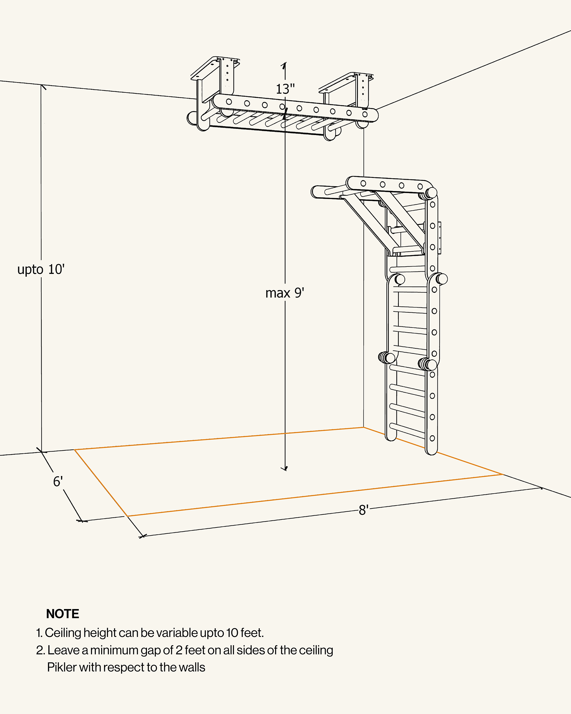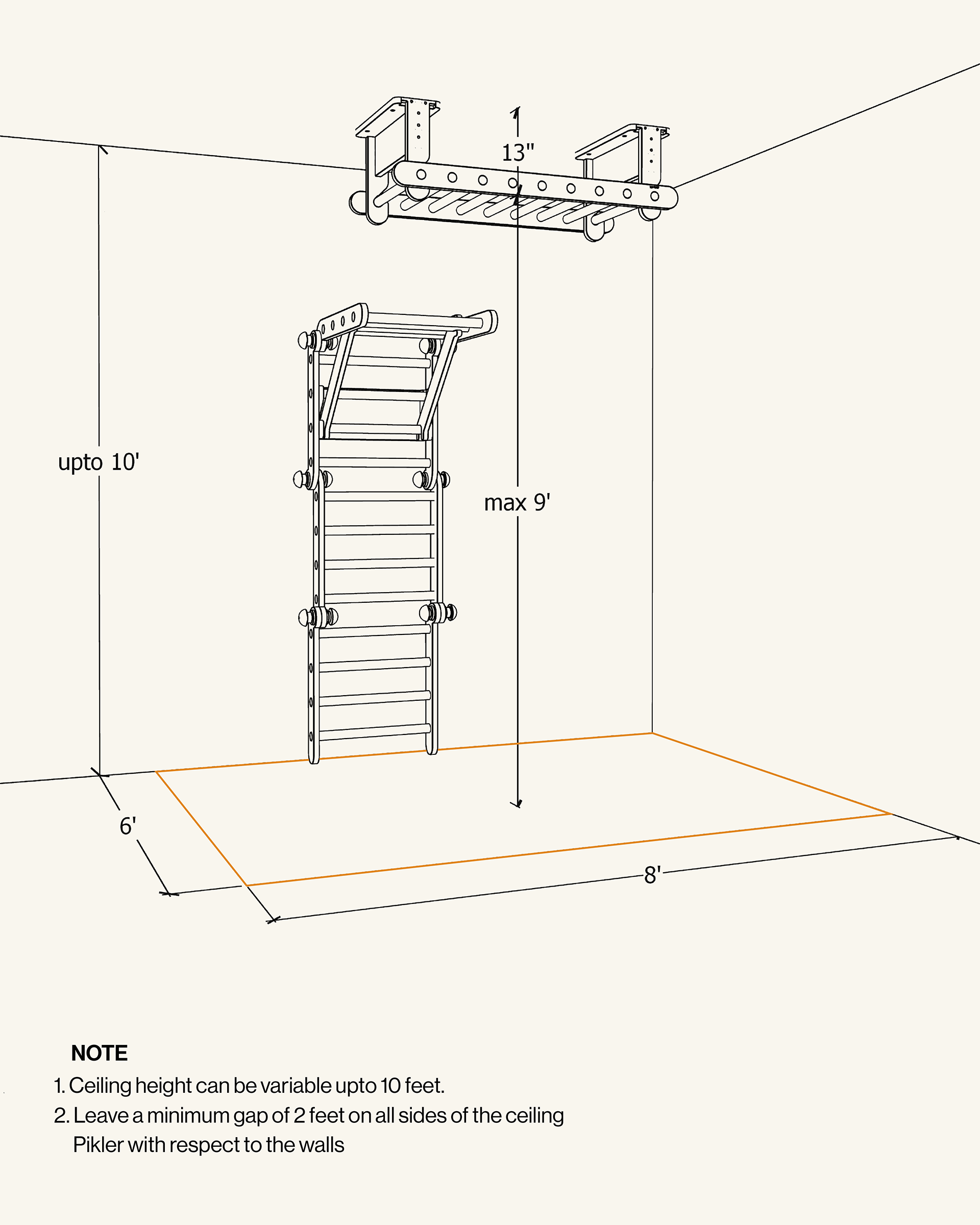 - Imp Note: The Ceiling Pikler can only be installed on a concrete true ceiling. In case of a false ceiling, additional steps are required to access the concrete true ceiling for installation.