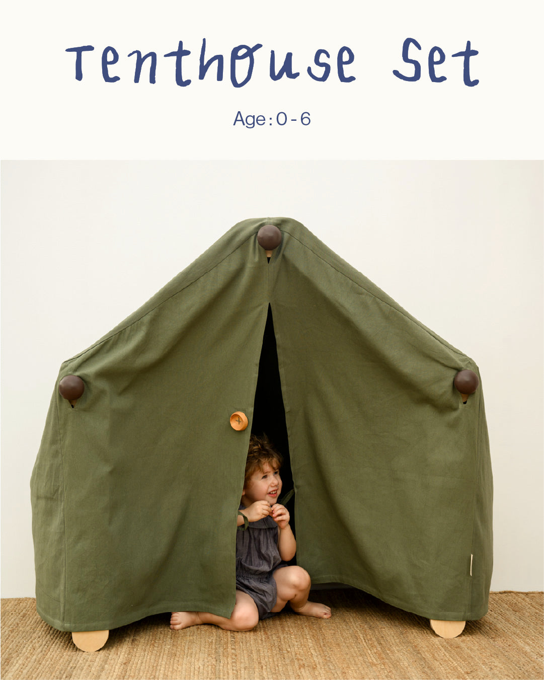 The Tent is a simple slip-on design and can be taken on and off easily. Fits the Bloon Pikler MAX in 'house' position. A handcrafted wooden button serves as a door-knob and ‘locks’ the door, to make the nook even cosier.